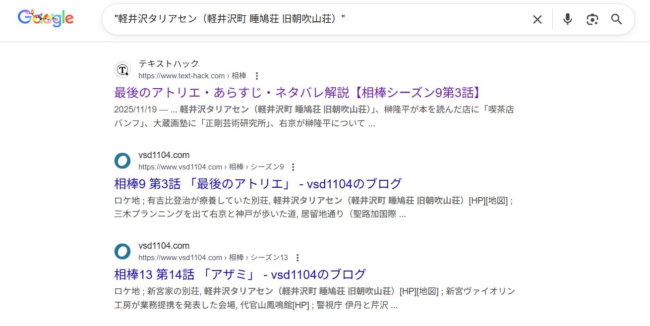 いつまで表示されるかわかりませんが、「軽井沢タリアセン(軽井沢町 睡鳩荘 旧朝吹山荘)」をダブルクォーテーションで囲って検索すると、僕のサイトと「テキストハック」だけが表示されます。