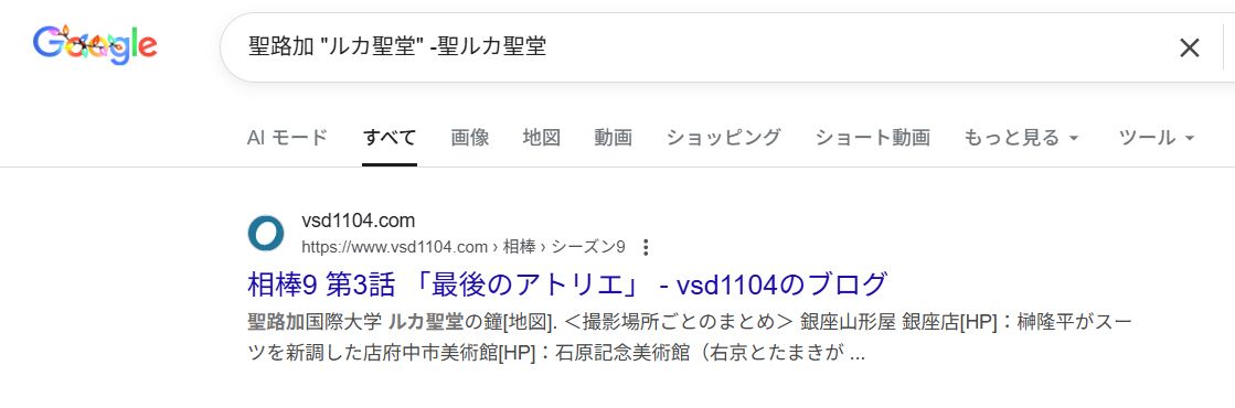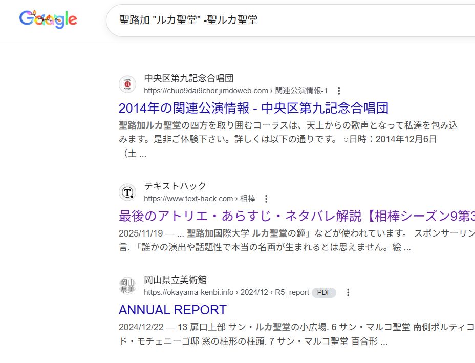 そして「聖路加 “ルカ聖堂” -聖ルカ聖堂」で検索すると、出てくるのは僕のサイトと「テキストハック」を含めてわずか数件です。自分のミスを自分で指摘するのもあれですが、実は「ルカ聖堂」というのは間違いで正しくは「聖ルカ聖堂」なんです。そんな、ほとんどの人がしていないミスを僕と同じようにしていたのはなぜですかね? 「他人の答えを写したら間違いまで同じだったためカンニングがバレた」という印象を受けますが、たまたま同じミスをしたのでしょうか?