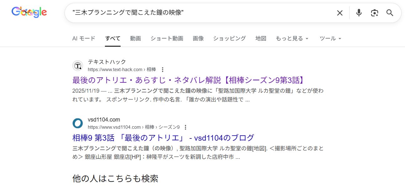 これもいつまで表示されるかわかりませんが、「三木プランニングで聞こえた鐘の映像」をダブルクォーテーションで囲って検索すると、僕のサイトと「テキストハック」の両方で「三木プランニングで聞こえた鐘の映像」は「聖路加国際大学 ルカ聖堂の鐘」としているのがわかります。「三木プランニングで聞こえた鐘の映像」についてはかっこの有無の違いはありますが、「りさま屋(note)」の項目で書いたように、同じ状況の説明でも書く人によって違いが出るものなのに「三木プランニングで聞こえた鐘の映像」なんて一致するものでしょうか?