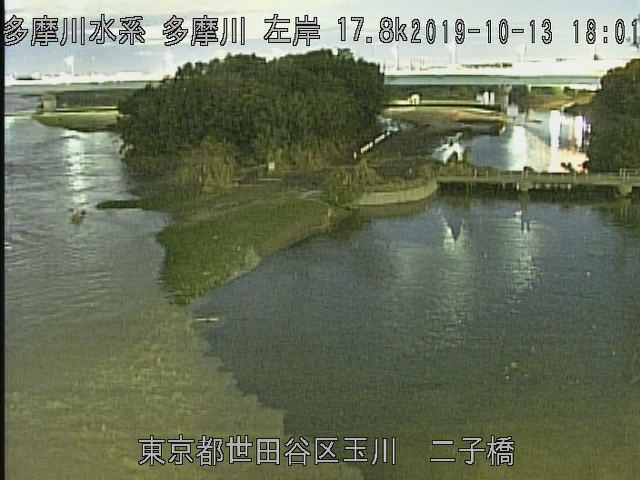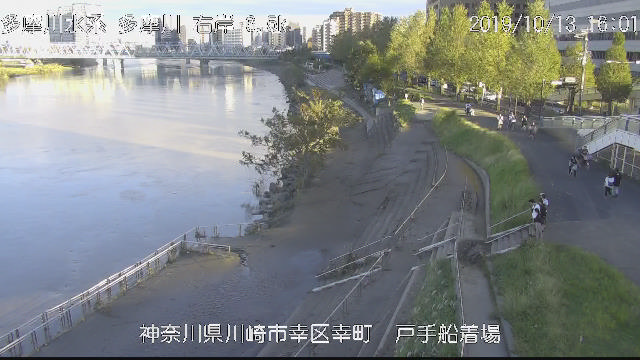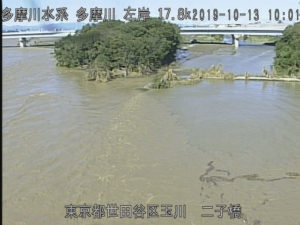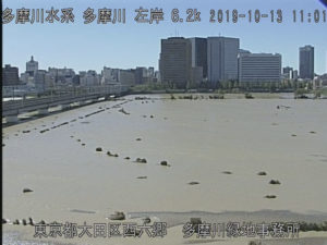 2019年10月13日、台風19号が過ぎ去って一夜明けた多摩川ライブカメラの画像。河口から二子玉川まで。台風接近時(12日)の様子はこちら。
