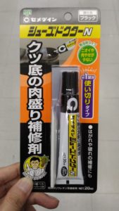 100円ショップで何かないかな、と思って何店か回ってみたもののめぼしい物はなく、ふとコーナンに行ったらセメダインのシューズドクターN(20ml)というのがあり、買ってみました。コーナンでは税込み437円。